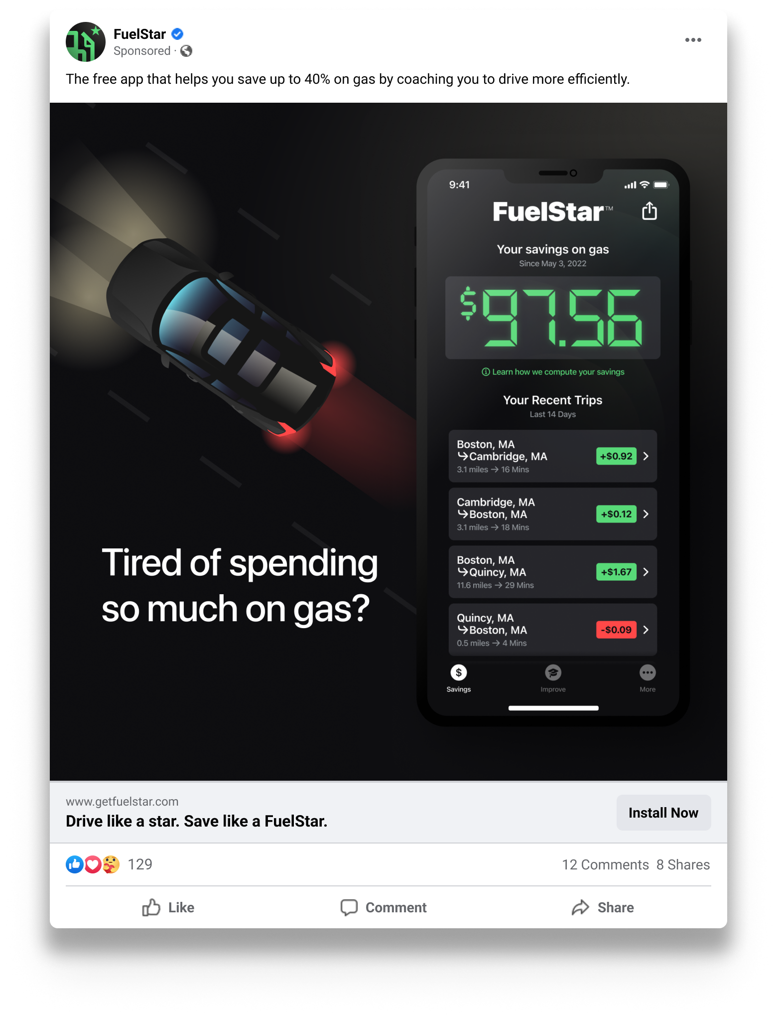 We first validated demand and value by running targeted Facebook ads to a painted-door landing page with sign-ups. Once demand was confirmed, we rigorously A/B tested acquisition strategies focused on fuel savings, continuously optimizing costs while driving app downloads.