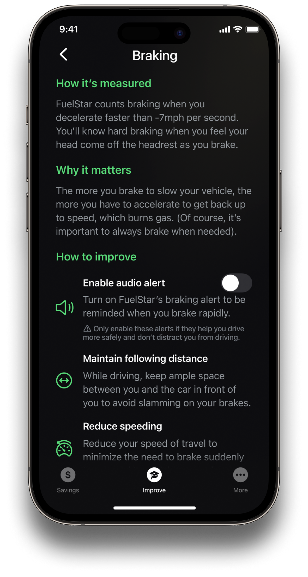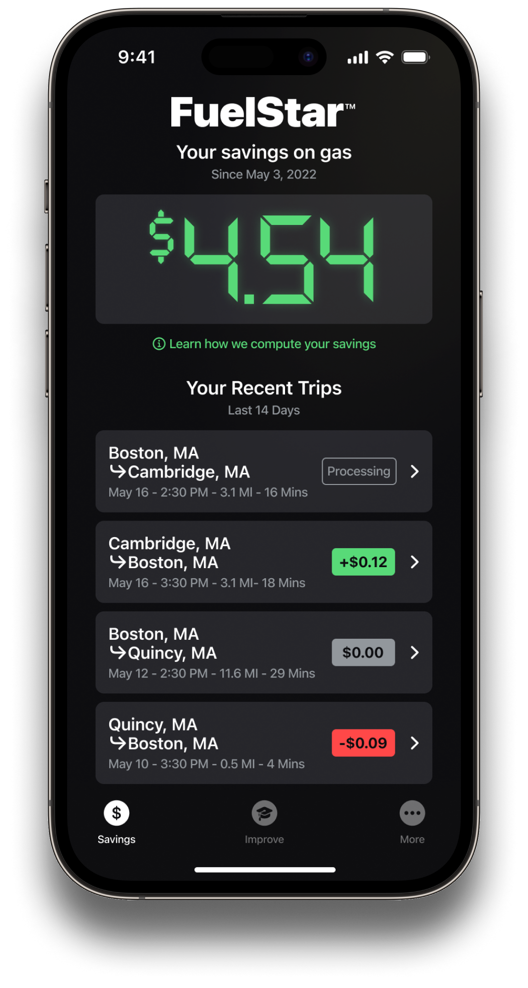 An app that helps drivers save up to 40% on gas by driving safer, leading to better efficiency.